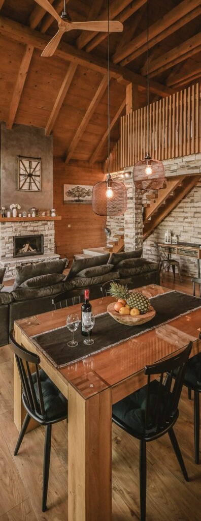 - Interijer od drva s kaminom na drva